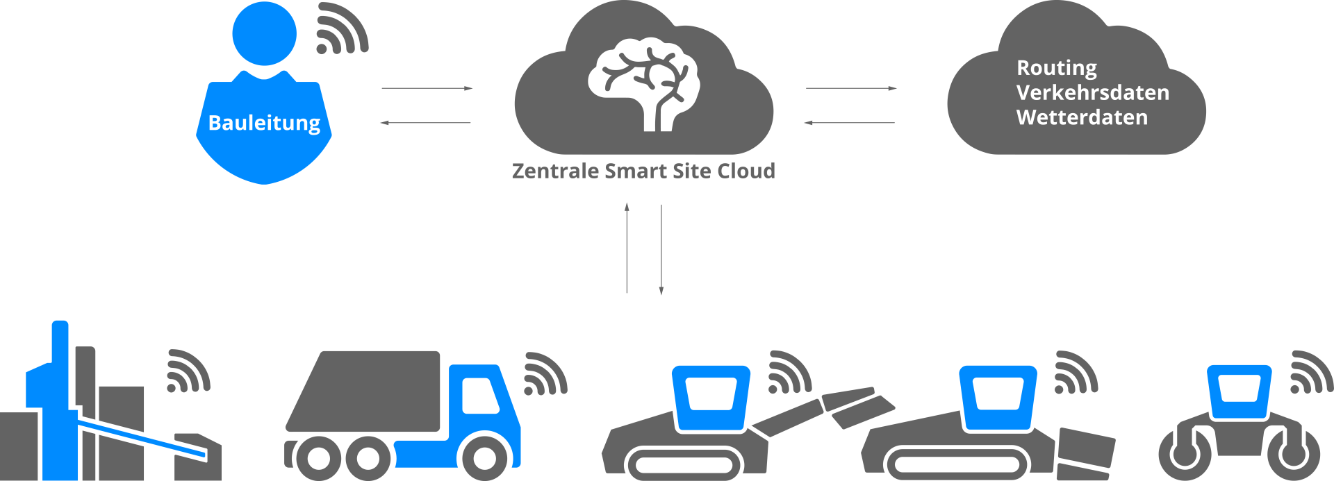 Smart Site One sammelt alle wichtigen Daten über Sensoren und Schnittstellen. In der Cloud wird der optimale Ablauf vorausberechnet.